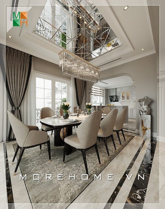 Bộ bàn ghế phòng ăn cao cấp được bọc da sang trọng nổi bật trên nền đá trong thiết kế biệt thự, nhà phố sẽ khiến bạn ấn tượng và mong muốn sở hữu.