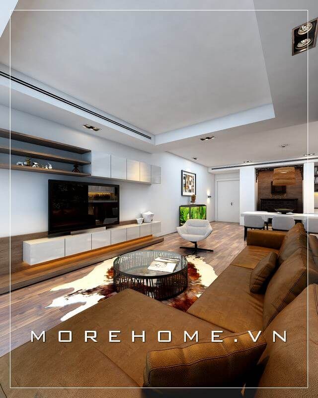 Ý tưởng trang trí không gian nội thất phòng khách sử dụng cách kết hợp 2 tone trắng, nâu thể hiện đối xứng, liền mạch trong từng gam màu đã tạo nên vẻ đẹp độc đáo, sáng tạo cho toàn bộ không gian căn hộ