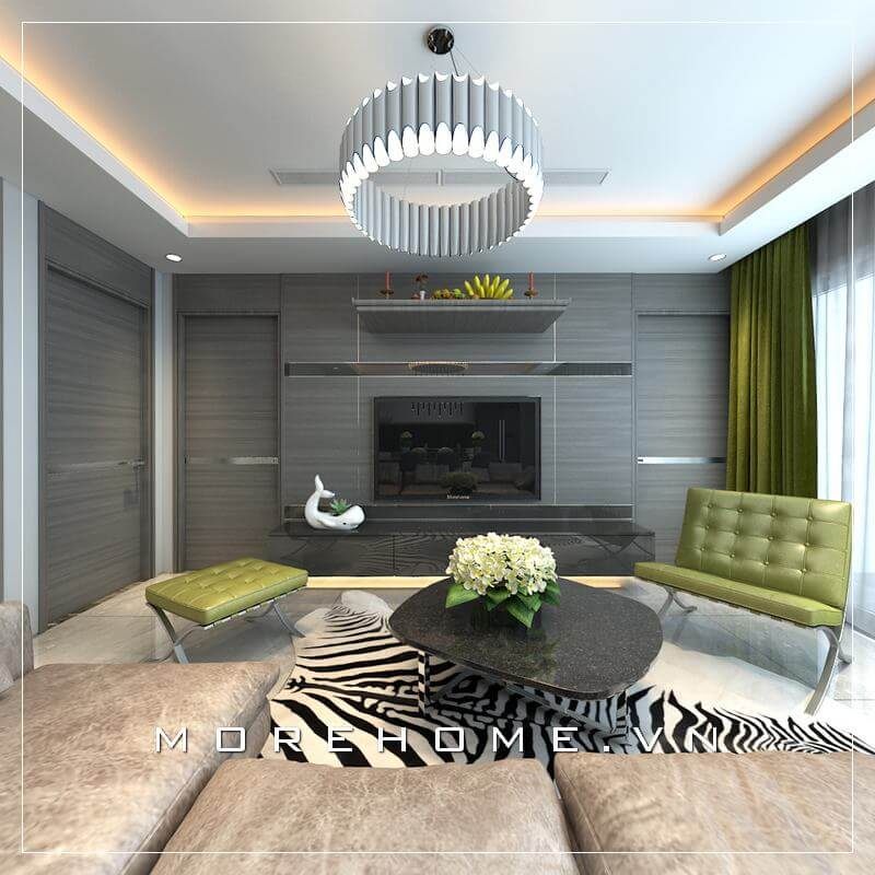 Nội thất phòng khách hiện đại ấn tượng với tone màu ghi xám chủ đạo tạo nên một nét đẹp tinh tế, trẻ trung trong mẫu thiết kế chung cư đẳng cấp này