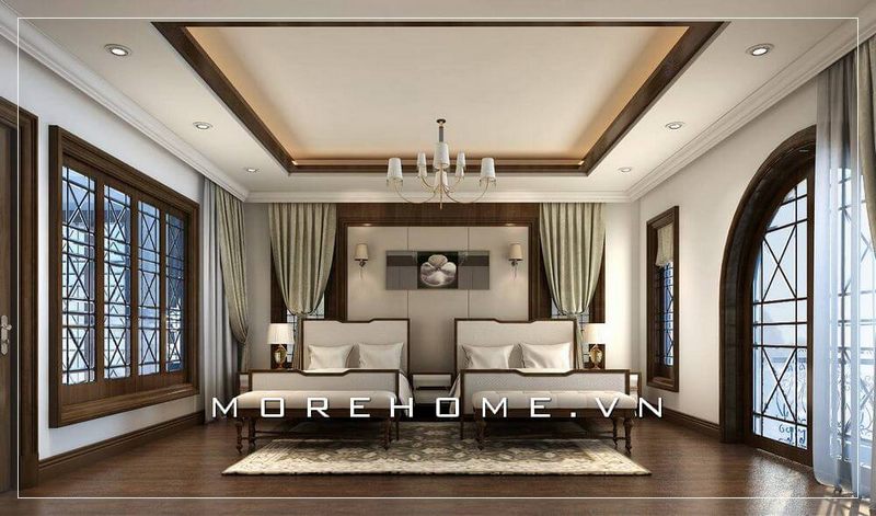 Thiết kế nội thất giường ngủ biệt thự cao cấp với chất liệu gỗ óc chó phong cách tân cổ điển