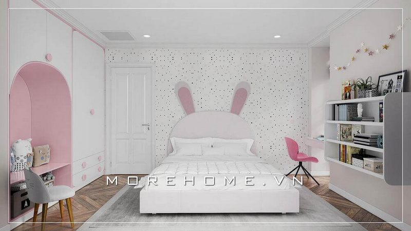 Thiết kế phòng ngủ cho bé gái với màu sắc hồng nhẹ nhàng, dễ thương.